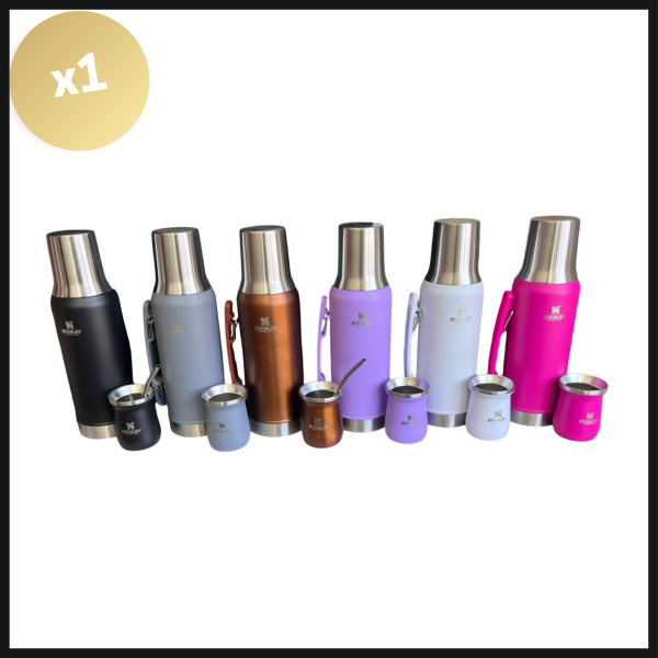 Termo de acero inoxidable con manija, de 1200ml de capacidad, con mate a juego y bombilla metálica.