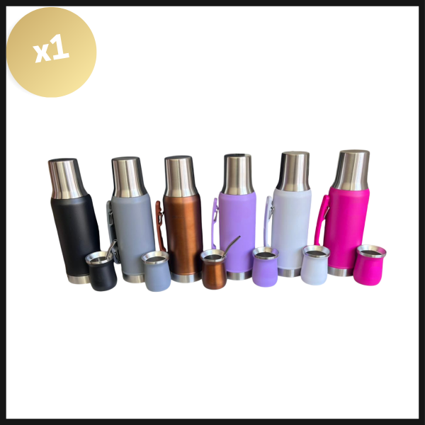 Termo de acero inoxidable con manija, de 1200ml de capacidad, con mate a juego y bombilla metálica.